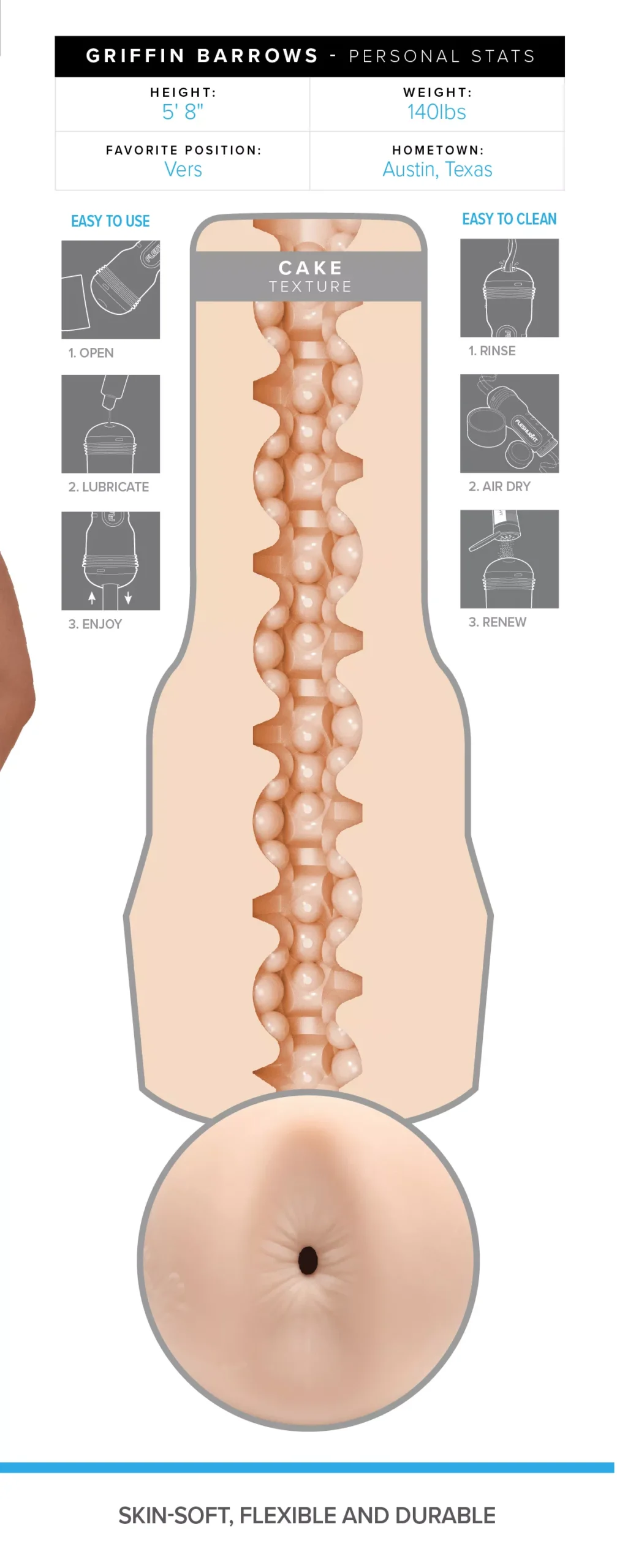 Pasilepinkite su Griffin Barrows – nuostabiu masturbatoriumi, kurio anuso anga sukurta pagal garsios pornografijos žvaigždės modelį. Žinoma dėl savo diskretiško dizaino, „Fleshjack Boys“ serija visiškai pateisina savo pavadinimą. Išimamas įdėklas pagamintas iš „SuperSkin“ – kūnui saugaus silikono, kuris yra nepaprastai minkštas ir patogus. Ši medžiaga greitai įkaista, o tai yra didelis privalumas. Viduje yra gumbelių ir briaunelių, o skirtingos „kameros“ turi savo unikalią tekstūrą. Galiniame dangtelyje galite nustatyti norimą vakuumo lygį. Visa ši kombinacija suteikia labai realistišką, intensyvų pojūtį ir nuostabią patirtį. Anga yra lanksti ir visiškai prisitaiko prie jūsų penio dydžio. Plastikinis dėklas užtikrina tvirtą masturbatoriaus laikymą. Įdėklą lengva valyti, todėl „Fleshjack“ yra puikus žaislas begaliniam malonumui.