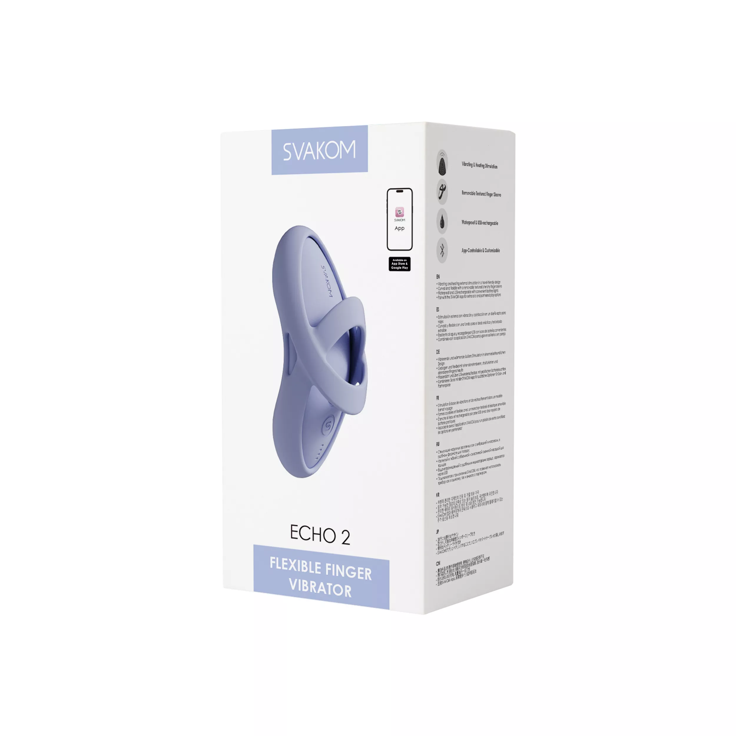 „Svakom Echo 2“ dangaus mėlynumo atspalvio yra jūsų slaptas ginklas gundantiems potyriams bet kuriuo metu. Šis elegantiškas piršto vibratorius siūlo 5 vibracijos režimus, 5 intensyvumo lygius ir šildymo funkciją iki 38 °C intensyviam išorinių erogeninių zonų stimuliavimui. Rifliuotas, nuimamas antgalis suteikia dar daugiau pojūčių kiekvienu prisilietimu.